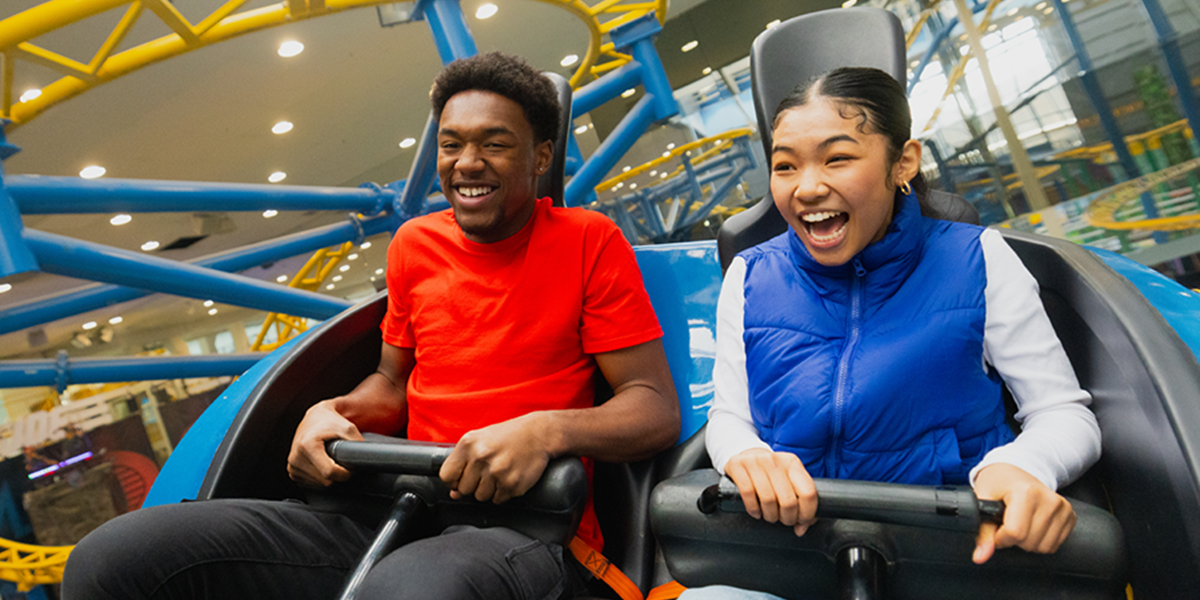 Four-person cars spin while travelling 1,500 feet of roller coaster track at high speeds—producing upwards of 3.3Gs, while touring the entire park.