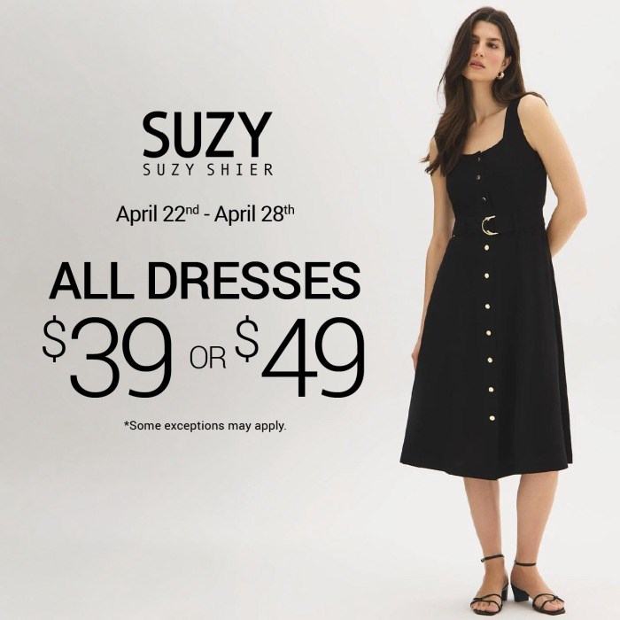 Welcome to the new Suzy Shier | Le Château premium boutique, Canada’s newest and most innovative fashion experience! Here you will find the home of both Canadian legacy brands: Suzy Shier, for all your casual, week-end, and workwear fashion essentials as well as Le Château, for all your special occasion dresses, footwear, and accessories. Now you can find all the fashion you need under one roof. Full service for all of your fashion needs: Suzy by Day, Le Château by Night!