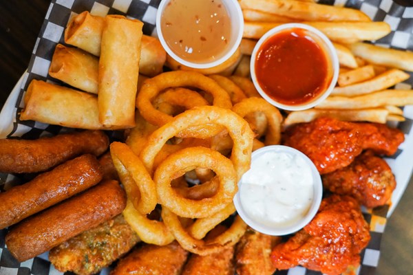 Try our assortment of crispy hot wings, battered onion rings, pickle spears, crunchy spring rolls, and our classic fries. Served with ranch, plum, and ketchup.