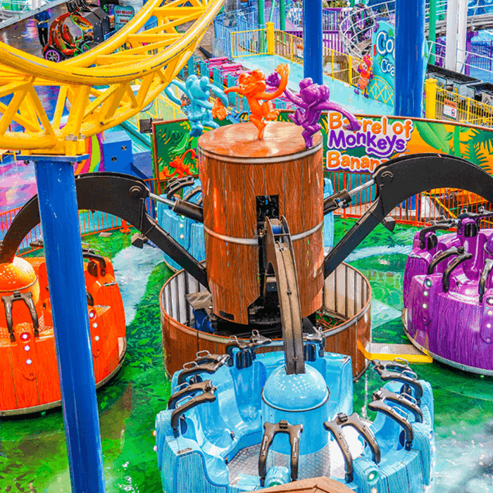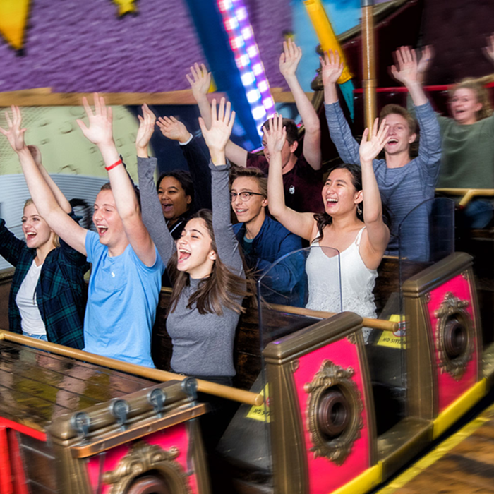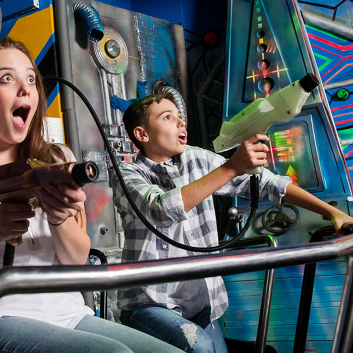 Help defeat the alien "Quirks" in this exciting, fast-paced target shooting game. Riders test their reflexes by trying to hit as many targets as possible while seated on a car that moves through the attraction. Flashing lights, loud sounds, and other surprises will keep you on your toes the whole time. Don't forget to check your high score on the way out!