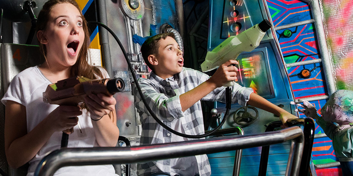 Help defeat the alien "Quirks" in this exciting, fast-paced target shooting game. Riders test their reflexes by trying to hit as many targets as possible while seated on a car that moves through the attraction. Flashing lights, loud sounds, and other surprises will keep you on your toes the whole time. Don't forget to check your high score on the way out!