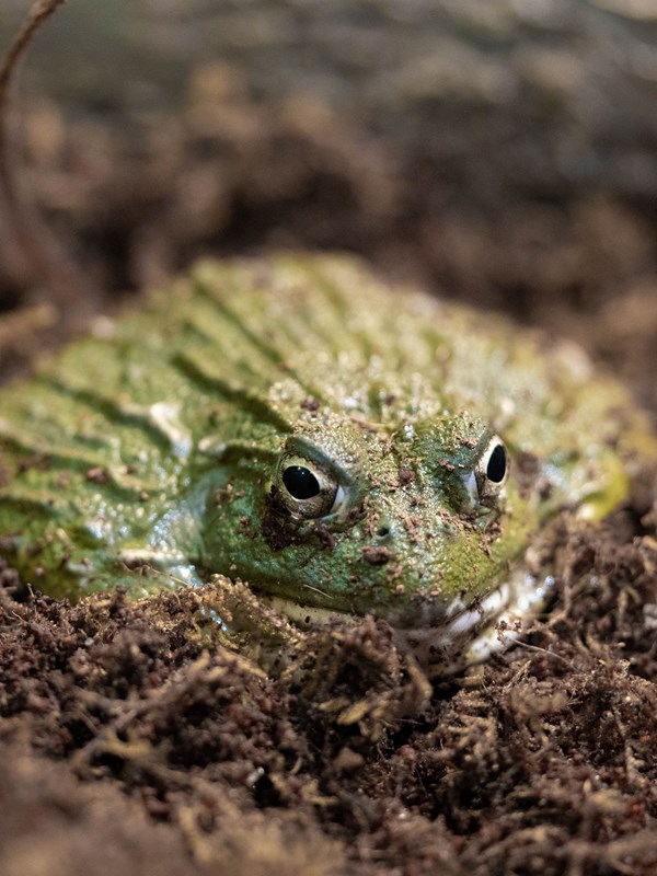 During times of drought, African bullfrogs can burrow underneath the ground and stay there for more than a year. They slough-off several layers of skin to form a tough cocoon. While underground their bodily functions slow down—a process known as estivation.