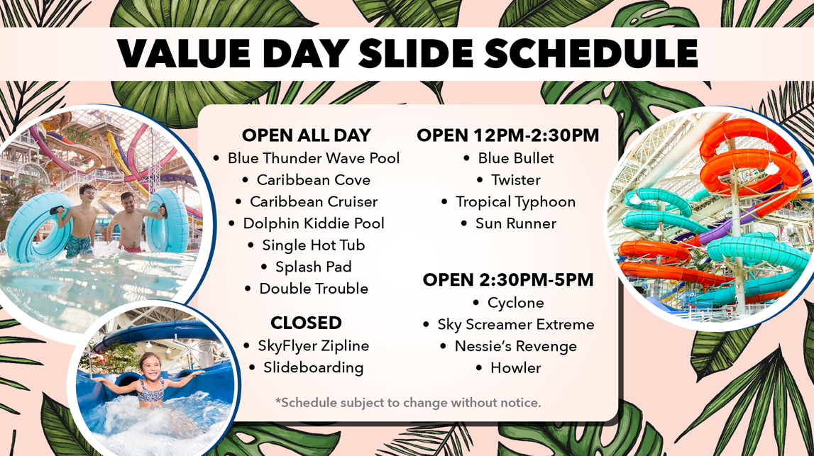 Get ready for non-stop splash action at World Waterpark at a lower price on select weekdays!